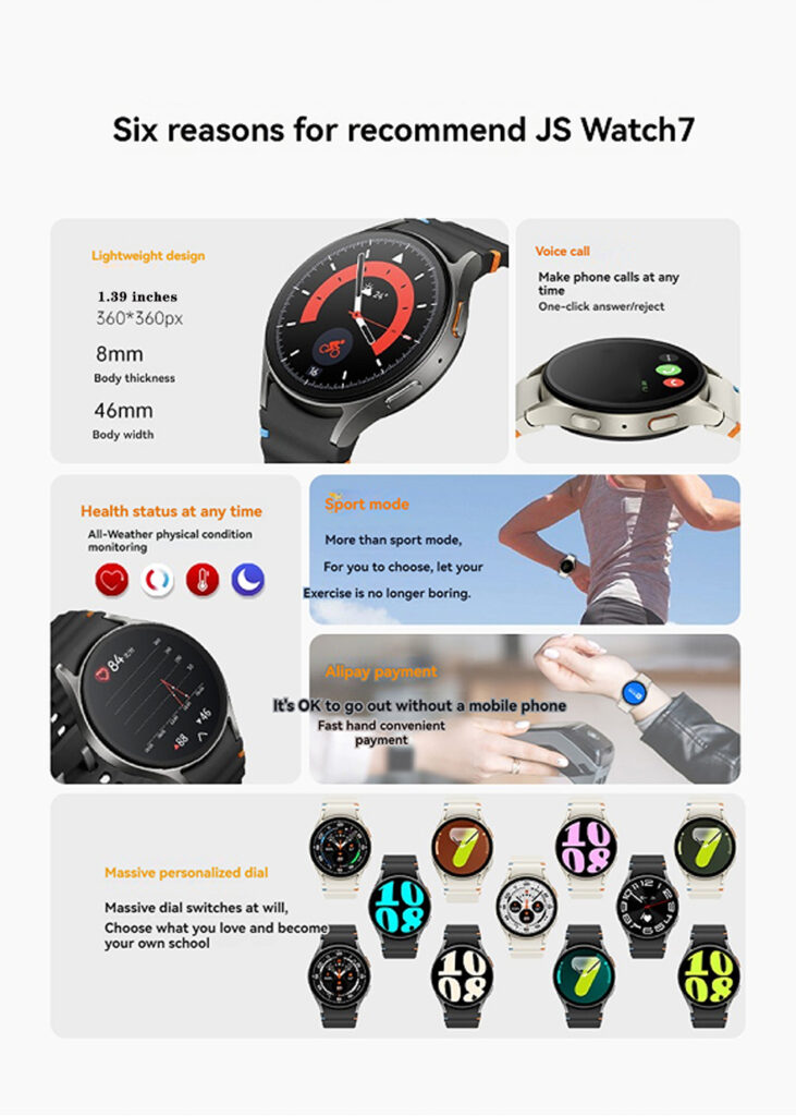 This newly launched JS WATCH 7 Smartwatch has mind blowing exotic features that make it stand out best among the new generational watches, deep water resistance powered waterproof. It enables you keep fit of your health status such as checking your BP, heart rate and also serve for sports and out door recreational activities, with a wider and large screen HD display resolution, makes and receive calls directly from the watch which is wireless and seamless. The watch keeps you updated via notifications from your social media platforms which displays directly from the watch and also has a longer battery life span, making it the best among the rest.